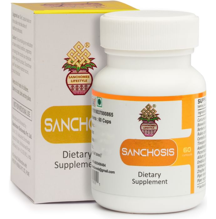 Sanchomee Sanchosis Capsule A natural dietary supplement to help in detoxifying infected skin ailments. It inhibits the proliferation of skin cells and is anti-inflammatory, antioxidant, anti-allergic, antiviral and antibacterial in nature. It is useful in dealing with arthritis, asthma, inflammatory bowel disease, etc. | Key Ingredients: Turmeric Shallaki Daruharidra Manjishtha Gotu kola Guduchi Neem Kutki Garlic Amla Ashwagandha Trikatu | Key Benefits: It inhibits the proliferation of skin cells and is anti-inflammatory, antioxidant, anti-allergic, antiviral and antibacterial in nature It has anti-inflammatory and anti-psoriatic activity helps in quick healing of skin and protects the skin from further damage It is useful in dealing with haemorrhoids, gynaecological disorders, diabetes, ear infections, wound healing, skin diseases and malarial fever It has anti-proliferative action on skin cells, supports skin health, purifies the blood and helps in liver and kidney functions It promotes wound healing, removes scars, reduces pain and swelling improves blood circulation This product acts on brownish-black discolouration, scaling-roughness and hardness of skin in psoriasis It supports immune function, reduces fever, manages digestive problems, liver problems and gout and rheumatism It is useful in leprosy, intestinal worms, stomach upset, loss of appetite, skin ulcers, cardiovascular diseases, fever, diabetes, gum disease and liver problems It cleans the colon, is used for yellowed skin (jaundice), acute viral hepatitis, fever, allergy and asthma, also used to deal with skin conditions including eczema and vitiligo | Directions For Use: Use as directed on the label or as advised by your healthcare provider. | Safety Information: Read the label carefully before use Store in a cool and dry place away from direct sunlight Keep out of reach of children
