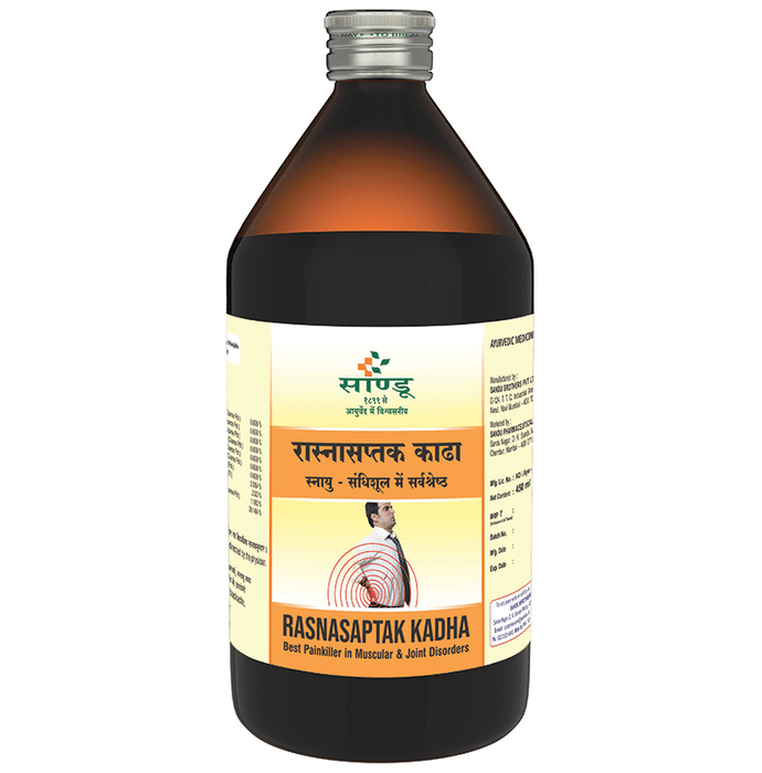 Sandu Rasnasaptak Kadha is a potent ayurvedic formulation that can provide relief from the pain in the musculoskeletal system. It may also relieve arthritis, rheumatoid arthritis (aamvata) and various muscular aches. Rasna present in this formulation has beneficial anti-inflammatory properties that can eliminate toxins affecting joints. | Key Ingredients: Rasna (Vanda roxburghii) Eranda (Ricinus communis) Devadaru (Cedrus deodara) Punarnava (Boerhavia diffusa) Aaragwadh (Cassia fistula) Guduchi (Tinospora cordifolia) | Key Benefits: This kadha can alleviate pain, stiffness and swelling of joints in arthritis (sandhivata) and similar joint diseases Rasna present in this formulation can help pacify vata and is effective in dealing with gout and other diseases due to vitiated rakta (impure blood) and vata It can provide relief from back pain, inflammation in the joints, muscles and ligaments and muscular sprains Sandu Rasnasaptak Kadha has blood purifying actions that can remove toxins from the body It may improve the mobility of the joints | Directions For Use: 2-6 teaspoonfuls (10- 40 ml) 2-3 times a day with an equal quantity of lukewarm water after a meal or as directed by the physician. | Safety Information: Read the label carefully before use Do not exceed the recommended dosage Store in a cool and dry place away from direct sunlight Keep out of reach of children