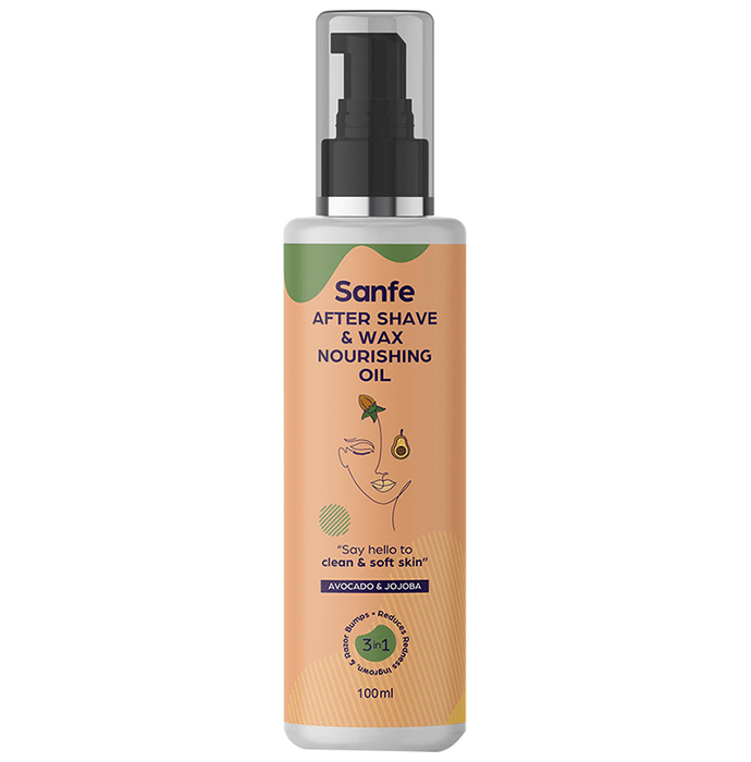 Sanfe After Shave & Wax Nourishing Oil Sanfe After Shave & Wax Nourishing Oil is specially crafted to suit Indian skin and concerns. It is enriched with the goodness of avocado, jojoba, sunflower and sweet almond extracts; this aftershave oil gives you 3 in-1 benefits. It removes wax residue and nourishes and moisturises the skin, making it soft and smooth. It helps reduce redness, ingrown and razor bumps. This nourishing oil contains 100% natural ingredients and is cruelty-free and FDA-approved.