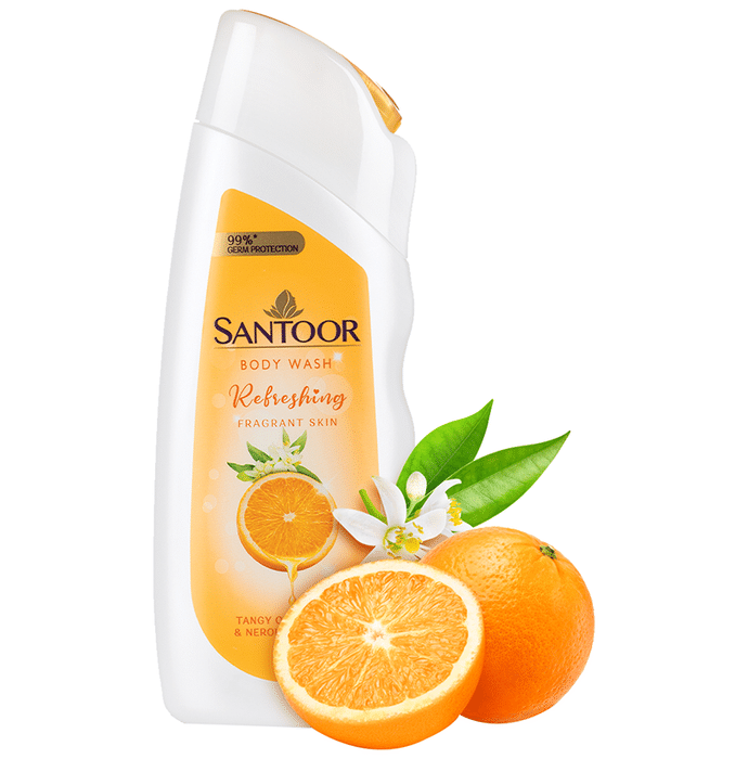 Santoor Refreshing Fragrant Skin Body Wash is infused with the goodness of organically grown ingredients like virgin coconut oil and moringa extracts, which nourish and moisturize your skin to make it supple, smooth, soft and bouncy. This body wash alleviates dryness, adds liveliness to the skin, and enhances your bathing experience with its lovely fragrance. | Uses: This body wash gives deep and refreshing baths that moisturize your skin to reduce dryness and make it supple. | Product Specifications and Features: The tangy orange oil helps wake up and revitalize your skin with a blast of energy to make it look lively and maintain its health This skin body wash contains neroli extracts and rewards your skin with a refreshing and youthful glow Its lovely fragrance of ylang, hawthorn, sage and balsamic energizes and stimulates your mood for a delightful bathing experience It is a creme based body wash that is soap and paraben-free, has skin-friendly pH and provides protection from germs | Directions for Use: Pour body wash on wet loofah Massage gently over your wet body to lather Enjoy the refreshing experience and rinse off | Safety Information: Read the label carefully before use Store in a cool and dry place away from direct sunlight Keep out of reach of children