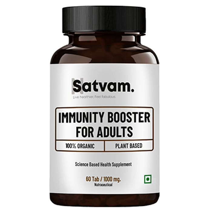 Satvam Immunity Booster for Adults Tablet It is a dietary supplement formulated with ashwagandha, ginseng, wheatgrass, moringa and other ingredients that may improve stamina, endurance, vitality and strength. It has antioxidant and anti-inflammatory properties, which protect the body against free radicals and boost immunity. It may help prevent infections and nutritional imbalance. | Key Ingredients: Withania somnifera ext. (Ashwagandha) Panax ext (Ginseng) Medicago Sativa ext. (Alfalfa) Lepidium meyenii ext. (Maca) Thinopyrum intermedium ext.(Wheatgrass) Boswelia floribunda ext. (Sallaki) Centella asiatica ext.(Gotukola) Moringa Olifera ext (Moringa) Tribulus terrestris ext. (Gokshura) Bacopa monnieri ext. (Brahmi) Chlorophytum borivilianum ext.(Safed Musli) Hippophae ext. (Sea buckthorn) Curcuma longa ext. (Curcumin) Agaricus bisporus ext. (Mushroom) Senna alexandrina ext. (Senna) | Key Benefits: It is a dietary supplement that may improve stamina, endurance, vitality and strength It has antioxidant and anti-inflammatory properties, which protect the body against free radicals and boost immunity It may help prevent infections and aid in nutritional imbalance | Directions For Use: Take two tablets twice daily before meals or as directed by your physician | Safety Information: Read the product label carefully before use Store in a cool and dry place away from direct sunlight Keep out of reach of children Consult a doctor before taking any supplement Do not exceed the recommended dosage Pregnant or nursing mothers, children, and people with medical conditions must consult a physician before taking this supplement Do not use if the product appears to be tampered with or the seal is broken