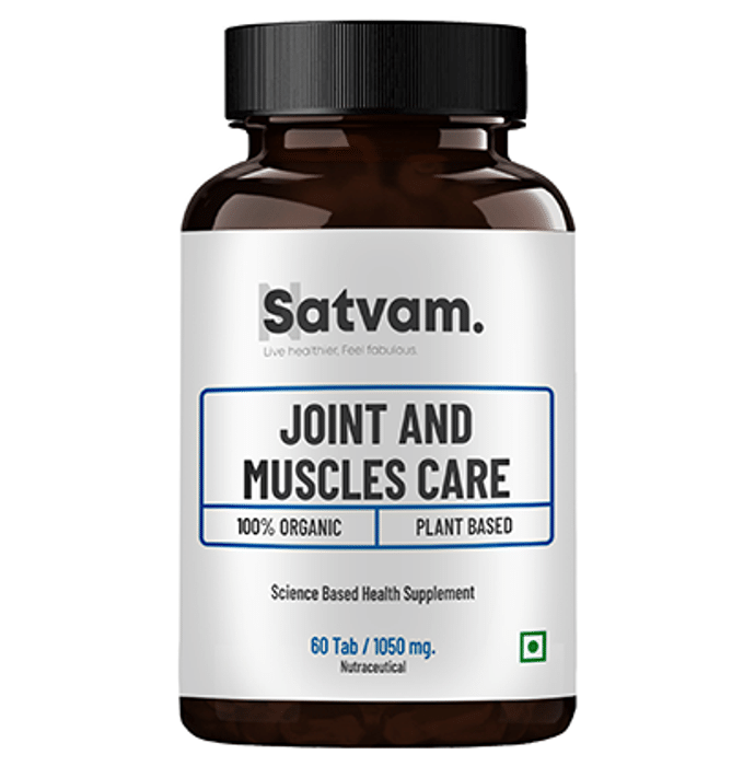 Satvam Joint and Muscles Care Tablet It is a dietary supplement formulated with curcumin, guggul, giloy, clove and other ingredients that relieve joint pain naturally. It provides vital nutrients for bones and stimulates joint mobility. It has anti-inflammatory properties, which relieve joint discomfort and reduce arthritis pain. | Key Ingredients: Boswelia serrata ext. (Salllaki) Curcuma longa ext. (Curcumin) Commiphora mukul ext. (Sudhh Guggul) Tinospora cordifolia ext. (Giloy) Syzygium aromaticum ext. (Clove) Eucalyptus globulus ext. (Eucalyptus) Valeriana officinalis ext. (Velerin) Vitex negundo ext. (Nirgundi) Piper nigrum ext. (Black piper) | Key Benefits: It is a dietary supplement that relieves joint pain naturally It provides vital nutrients for bones and stimulates joint mobility It has anti-inflammatory properties, which relieve joint discomfort and reduce arthritis pain It helps to strengthen the cartilage, relieve migraines and headaches and may improve symptoms of chikungunya It may improve symptoms of arthritis pain, inflammation, back pain, frozen shoulders, and cervical spondylitis | Directions For Use: Take two tablets twice daily before meals or as directed by your physician | Safety Information: Read the product label carefully before use Store in a cool and dry place away from direct sunlight Keep out of reach of children Consult a doctor before taking any supplement Do not exceed the recommended dosage Pregnant or nursing mothers, children, and people with medical conditions must consult a physician before taking this supplement Do not use if the product appears to be tampered with or the seal is broken