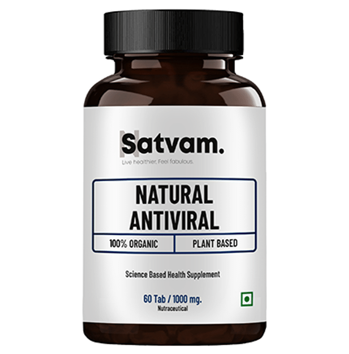 Satvam Natural Antiviral Tablet It is a dietary supplement formulated with giloy, ginseng, ashwagandha, brahmi, milk thistle and other ingredients that may help prevent infections. It has antioxidant and anti-inflammatory properties, which protect the body against free radicals and boost the immune system. It may help reduce fever, headaches, viral symptoms, body aches, allergies, or other bacterial infections. | Key Ingredients: Tinospora cordifolia ext (Giloy) Panax ext (Ginseng) Withania somnifera ext (Ashwagandha) Hippophae (Sea buckthorn) Boswellia Serrata ext (Sallaki) Curcumin (Turmeric) Medicago sativa ext (Alfalfa) Moringa oleifera ext (Moringa) Bacopa ext (Brahmi) Papaiya ext (Papaiya) Silimarine ext (Milk thistle) Boerhaavia diffusa ext (Punarnava) | Key Benefits: It is a dietary supplement that may help prevent infections It has antioxidant, antiviral and anti-inflammatory properties, which protect the body against free radicals and boost the immune system It may help reduce fever, headaches, viral symptoms, body aches, allergies, or other bacterial infections | Directions For Use: Take two tablets twice daily before meals or as directed by your physician | Safety Information: Read the product label carefully before use Store in a cool and dry place away from direct sunlight Keep out of reach of children Consult a doctor before taking any supplement Do not exceed the recommended dosage Pregnant or nursing mothers, children, and people with medical conditions must consult a physician before taking this supplement Do not use if the product appears to be tampered with or the seal is broken