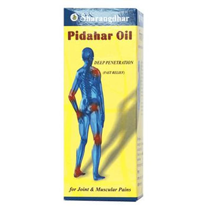 Sharangdhar Pidahar Oil It is a natural combination of anti-inflammatory, muscle relaxant and soothing herbs. The oil provides relief in the case of inflammation and pain, even in chronic conditions. | Key Ingredients: Nirgundi patra Bala panchang Shatavari mool | Key Benefits: Helps in managing painful conditions like arthritis and osteoarthritis Helps to alleviate muscle/ligament spasms and stiffness Helps to offer immediate symptomatic relief from joint pain and inflammation | Directions For Use: Use as directed on the label or as advised by your healthcare provider. | Safety Information: Read the label carefully before use Store in a cool and dry place away from direct sunlight Keep out of reach of children