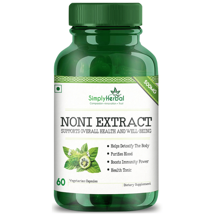 Simply Herbal Noni Extract Vegetarian Capsules is formulated to provide relief in the case of gout and also helps to detoxify the body. The capsule contains Noni as the main ingredients which is known to boost the immune system of the body and promote a healthy heart, skin, and digestive system. | Key Ingredients: Noni | Key Benefits: The capsule helps in the detoxification of the body Noni is rich in antioxidants, Vitamin C, Vitamin B3, Vitamin A and Iron and helps to strengthen the immune system It assist in lowering the risk of gout which is a kind of arthritis that causes joint pain Contains analgesic properties thus helpful in the case of arthritis Facilitates reduction of uric acid in the blood Works as a moisturizer for the skin and has the ability to repair and replenish it Noni contains tumor fighting properties Aids in reducing the effect of stress on the cognitive system Embodies antiviral properties thus beneficial in the case of cold, cough, fever, and body ache Improves the blood flow in the arteries thus promoting a healthy heart It helps to improve the lipid profiles Helps to reduce LDL (bad cholesterol) and improve HDL (good cholesterol) | Directions For Use: As directed by the physician. | Safety Information: Read the label carefully before use Store in a cool dry place away from direct sunlight Keep out of reach of the children Use under medical supervision