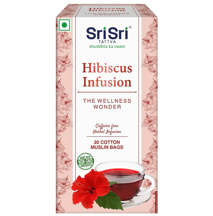 Sri Sri Tattva Hibiscus Infusion Cotton Muslin Bag Sri Sri Tattva Hibiscus Infusion is made from two unique herbs- japakusum (Hibiscus flower) and abaasthaki (Red sorrel). Its alkaline nature balances acidity in the body, thus ensuring overall health. It comes in eco-friendly, 100% muslin, hand-stitched cloth bags with no nylon, plastic, or chemically treated papers. These bags help retain the freshness and aroma of the ingredients and are great for brewing. | Key Ingredients: Japakusum/ Hibiscus - flower Japa bheda - plant Abaasthaki /Hibiscus - calyx | Key Benefits: Its alkaline nature balances acidity in the body It reduces body aches and pain It is a caffeine-free herbal infusion It makes you refreshed and energised | Directions For Use: Use as directed on the label | Safety Information: Read the product label carefully before use Store in a cool and dry place away from direct sunlight Keep out of reach of children