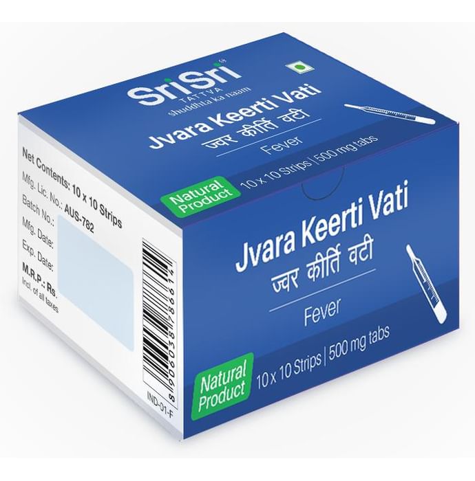 Sri Sri Tattva Jvara Keerti Vati 500mg Sri Sri Tattva Jvara Keerti Vati contains efficient anti-pyretic herbs and is indicated to treat all kinds of fever. It reduces symptoms associated with high fever, headache and body pain.