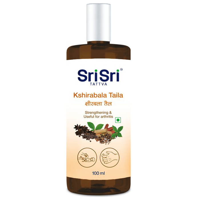 Sri Sri Tattva Kshirabala Taila is an ayurvedic oil prepared from Bala roots. The oil strengthens muscles and is used to treat arthritis. | Key Ingredients: Bala roots | Key Benefits: It strengthens muscles and reduces pain and inflammation of joints Enhances joint mobility Is extremely beneficial for growing children and newborn babies Treats facial paralysis, general debility, hemiplegia, monoplegia, arthritis, and spondylitis | Directions for Use: Massage oil on the affected area Cover it with the cloth, to keep it warm | Safety Information: Store in a cool, dry and dark place Protect from direct sunlight Read the label carefully before use Do not exceed the recommended dose Keep out of the reach and sight of children