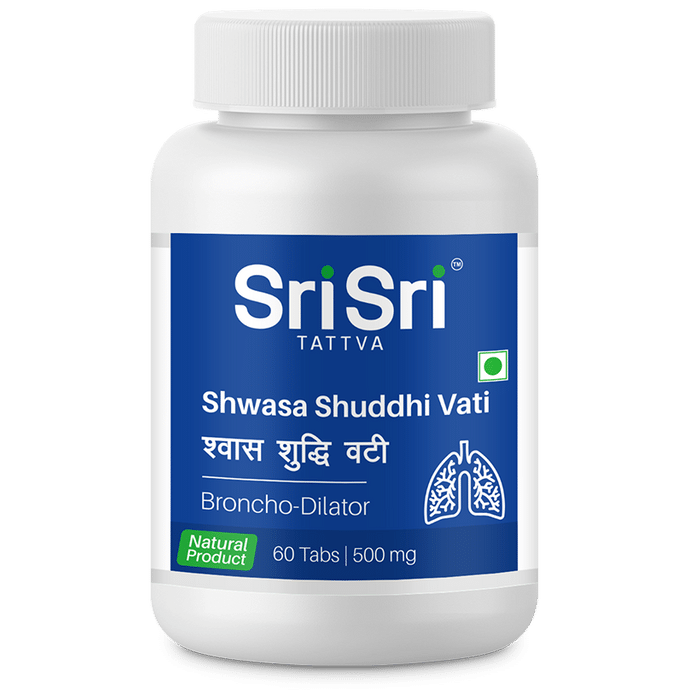 Sri Sri Tattva Shwasa Shuddhi Vati 500mg It the formulation of effective herbs to protect the respiratory system. These also help in scraping off the excessive, unwanted mucosal secretions that blocks the airway as a result of exposure to allergens, pollutants or infections, thereby cleansing the bronchial tree. These also acts as a potent broncho-dilator, thereby helps to prevent asthmatic conditions. It is indicated in dyspnoea, cough, and rhinitis.