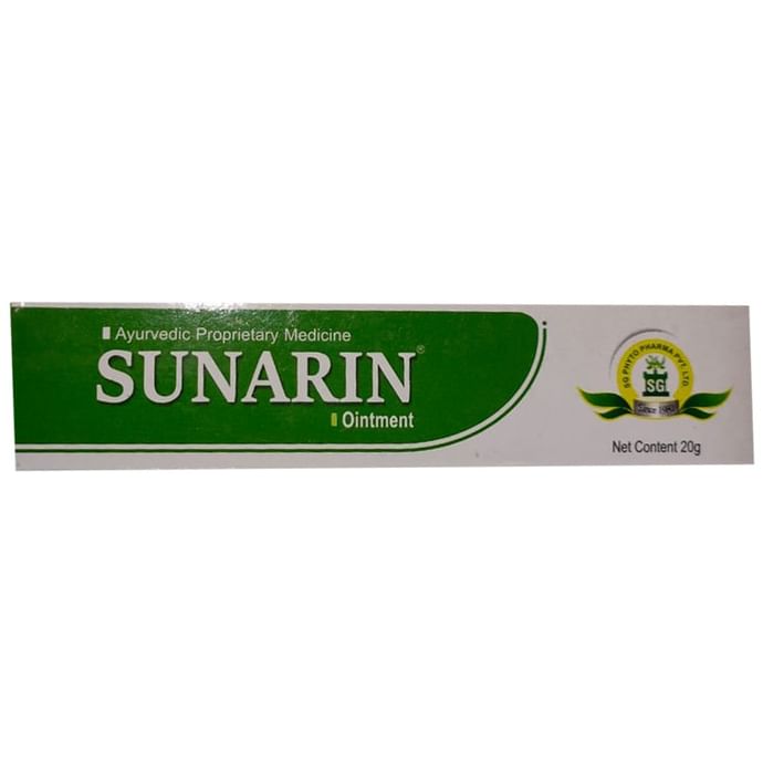 Sunarin Ointment is an ayurvedic ointment that is used to treat bleeding and non-bleeding piles, anal fissures (crack) and rectal inflammation. It contains herbal ingredients such as Kasisadi Oil and Vranaropan Oil. | Key Ingredients: Kasisadi Oil Vranaropan Oil Ointment base | Key Benefits: Sunarin Ointment provides relief in an acute fissure where anal pain is often severe Offers relief from burning sensation after passing stools Reduces itching around the anal region Prevents and reduces swelling over the anal region | Directions For Use: Cleanse the affected area and apply Sunarin Ointment liberally with the help of the applicator Apply it 2-3 times a day. It is for external use only | Safety Information: Use under medical supervision Keep out of reach of children Read the label carefully before use
