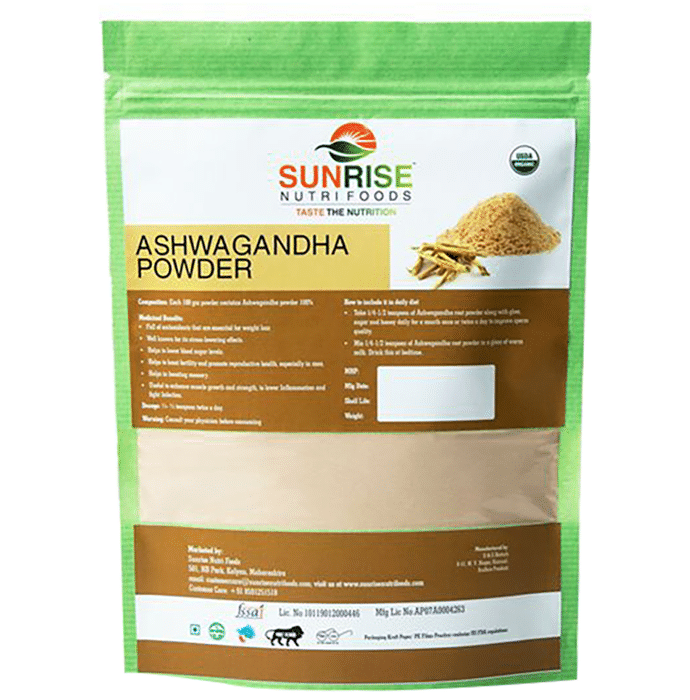 Sunrise Nutri Foods Ashwagandha Powder Sunrise Nutri Foods Ashwagandha Powder is an organic and US-DA certified product. Ashwagandha powder is full of anti-oxidants and used for stress-relieving effects. It is also beneficial for diabetes patients and also useful for improving fertility.