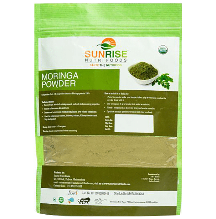 Sunrise Nutri Foods Moringa Powder Sunrise Nutri Foods Moringa Powder is organic and US-DA certified product. Moringa Leaf Powder is very useful for diabetic patients as it contains chlorogenic acid, moringinine and quercitine, which are very useful for reducing glucose level in blood.