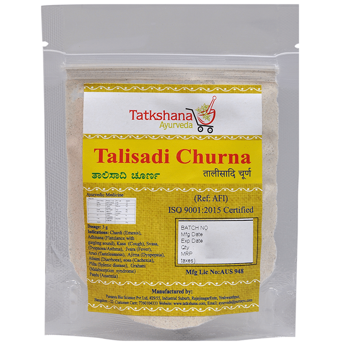 Tatkshana Ayurveda Talisadi Churna Tatkshana Ayurveda Talisadi Churna is a herbal powder that is very helpful in treating a common cold, running nose, itching the throat, cough etc. and is advisable to take by mixing with pure honey.