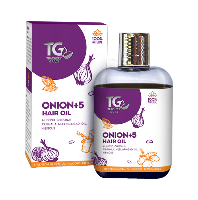 Teachers' Grace Onion+5 Hair Oil is a careful combination of over 26 herbs and oils, made with in-depth Ayurvedic knowledge received from master practitioners. It nourishes the hair and adds beauty and growth to it. Current-day pop Ayurveda products use mineral oils or chemically process hair oils to make them less oily and sticky. Unfortunately, these chemical processes deplete the nourishment properties of the oils and herbs. This onion hair oil is unprocessed and nourishes your hair the way an original hair oil does. | Key Ingredients: Onion Almond Neelibhringadi oil Triphala Hibiscus Chironji | Key Benefits: It has no toxins, no chemicals and is cruelty-free It promotes hair growth It inhibits premature greying of hair It delays hair thinning and breakage It helps maintain the ph level of the scalp It can help fight bacterial infections It also works as a natural conditioner It can improve hair texture and nourish hair follicles It helps improve the blood circulation of the scalp It Inhibits dandruff and repairs damaged hair It adds lustre and shine to the hair | Directions For Use: Apply oil from scalp to hair-end Gently massage with fingertips in circular motion Ideally keep hair oiled overnight or for at least 2 to 3 hours before washing | Safety Instructions: Store in a cool and dry place Read the label carefully before use Keep out of reach of the children