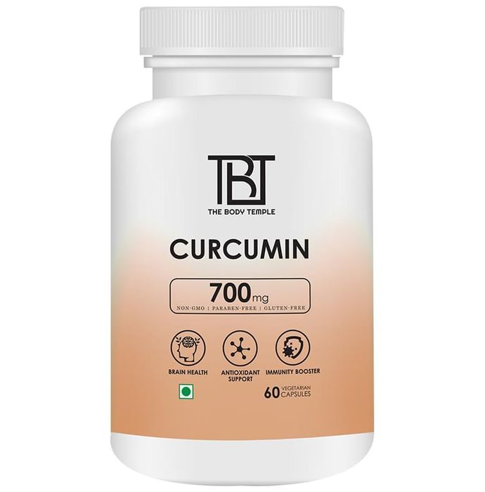 The Body Temple Curcumin Vegetarian Capsule 700 mg It is a dietary supplement formulated with curcumin, ginger and piperine extract that can boost immunity and support brain health. It is rich in antioxidants that protect against free radicals and help lower cholesterol levels. It has antioxidant and anti-inflammatory properties that can help promote healthy eyes, skin and hair. | Key Ingredients: Curcumin Ginger Piperine | Key Benefits: It is a dietary supplement that can support your brain health and boost immunity Piperine can enhance the absorption of curcumin by your body Curcumin C3 complex helps prevent tissue damage, promotes good cholesterol, and boosts immunity It has antioxidant and anti-inflammatory properties that can help promote heart health and boost immunity Sunthi has a strong anti-inflammatory action, which helps relieve cramps, sprains, sore throats, muscular aches, pains, constipation, indigestion, etc. Curcumin has antioxidant, anti-inflammatory and lipophilic properties, which improve the cognitive functions It can help promote healthy eyes, skin and hair and boost energy levels | Directions For Use: Take one capsule daily or as directed by your physician | Safety Information: Read the product label carefully before use Store in a cool and dry place away from direct sunlight Keep out of reach of children Consult a doctor before taking any supplement Do not exceed the recommended dosage Pregnant or nursing mothers, children, and people with medical conditions must consult a physician before taking this supplement Do not use if the product appears to be tampered with or the seal is broken