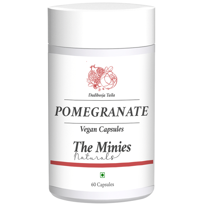 The Minies Naturals Pomegranate Vegan Capsule The Minies Naturals Pomegranate Vegan Capsule is a vegan capsule that contains pomegranate oil. The fruit, seeds, flowers, leaves, bark, and roots of pomegranate contain a chemical named 'polyphenol', which aids in various diseases and conditions. The pomegranate seed oil contains omega 5, omega 9, and omega 6 (linoleic acid) fatty acids that improve skin health and helps to maintain cardiovascular health.