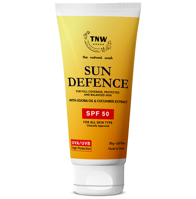 TNW- The Natural Wash SPF 50 Sun Defence contains SPF 50 and keeps the skin hydrated. It is enriched with natural ingredients and no harmful chemicals. It does not feel sticky or greasy on the skin. | Key Ingredients: Vitamine E Jojoba Oil Cucumber Extract Saffron Extract Aloe vera Extract Licorice Extract | Key Benefits: Enriched with natural ingredients that provide vitamins and nutrients to the skin SPF 50 protects from harmful UVA rays and prevents suntan It moisturizes the skin without making it look greasy Presence of saffron helps to brighten up the skin Paraben-free sunscreen that suits all skin types It is an ayurvedic formulation which protects the skin from tanning and also brings a natural glow to the skin | Directions For Use: Apply Sun defence SPF 50 before any sun exposure on a cleaned face. | Safety Information: Read the label carefully before use Keep out of reach of the children Store in a cool dry place