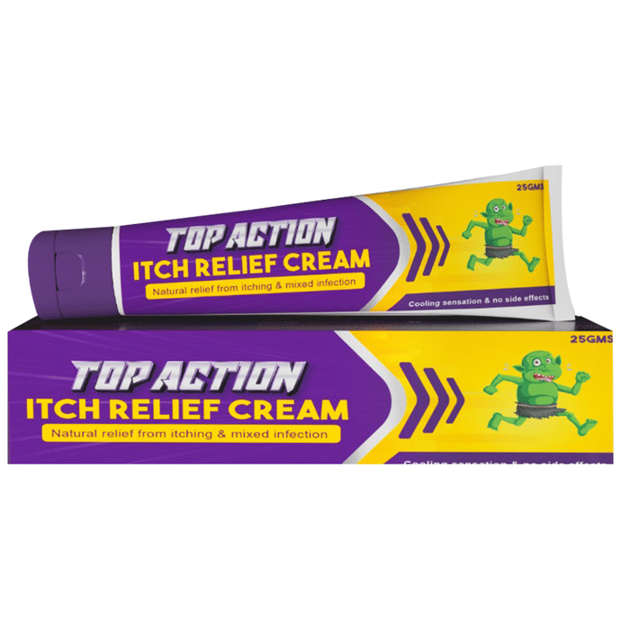 Top Action Itch Relief Cream is a blend of natural ingredients that may help prevent irritation and itching of the skin. It helps with eczema-related issues and soothes dry and sensitive skin. It can protect the skin against germs, fungus and bacteria. This cream can help to relieve redness, itchiness and skin discomfort. | Key Ingredients: Boric oxide Zinc oxide Menthol | Key Benefits: This cream may relieve itching and pain caused by minor skin irritation, burn and fungal infections It may prevent skin infections from spreading and protect the infected area from germs Menthol present in this cream imparts a cooling and soothing effect on the irritated area Boric oxide in this cream works as a mild topical astringent and anti-infective agent | Directions For Use: Use as directed on the label or as advised by your healthcare provider | Safety Information: Read the label carefully before use Do not exceed the recommended dosage Store in a cool and dry place away from direct sunlight Keep out of reach of children