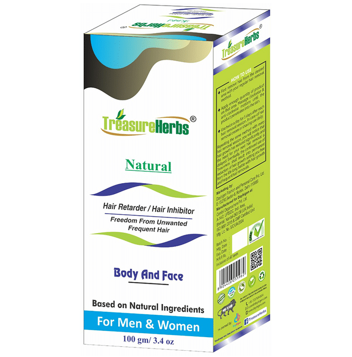 TreasureHerbs Natural Hair Retarder/Hair Inhibitor Cream gives freedom for unwanted frequent hair. It is suitable for both men and women. | Key Ingredients: Aqua Sunflower oil CCTG Glycyrl Papaya extract Dry powder Natural fragrance | Key Benefits: It reduces unwanted hair growth It stops hair growth in unwanted areas | Directions For Use: Apply it as a body lotion and massage until it gets absorbed into the skin. | Safety Information: Read the label carefully before use Store in a cool and dry place away from direct sunlight Keep out of reach of the children