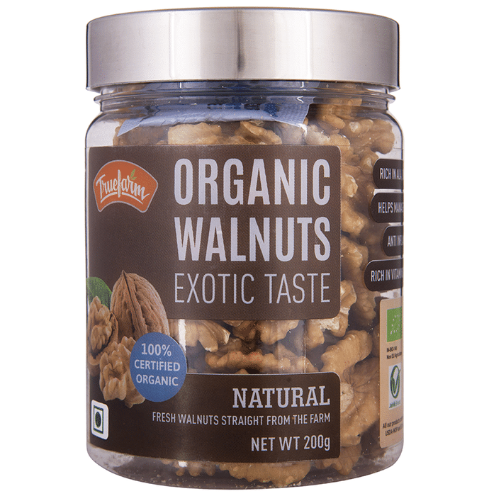 Truefarm Organic Walnuts Natural are a rich source of energy and hold many health-benefiting nutrients, minerals, antioxidants and vitamins that are essential for overall well being. Walnuts are one of the most nutritious nuts and help in optimum functioning of the brain. Key Ingredients: Walnuts Key Benefits: Walnuts are one of the most nutritious nuts They are a rich source of omega 3 fatty acids and help in optimum functioning of the brain Walnuts are a good source of polyunsaturated fats that are better than saturated fats They have an anti-inflammatory effect that keeps the blood vessels healthy Directions For Use: Use as directed on the label. Safety Information: Do not exceed the recommended dosage Store in a cool and dry place away from direct sunlight Keep out of reach of children