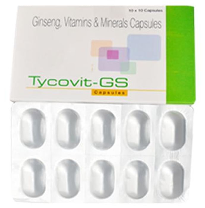 Tycovit GS Capsule Tycovit GS Capsule is a nutritional supplement which enriched with Ginseng extract, multivitamins and multiminerals. Ginseng possesses anti-fatigue, anti-stress, and CNS stimulant properties. Ginseng recuperate power of body and increases both physical and mental efficiency, hence Ginseng is known as ruler of good health in diabetes, CV disorders and stressed life. Role of Key Ingredients: Ginseng extract is a herbal extract,which builds energy, boosts immunity, improves blood circulation, revitalizes and aids recovery after illness. Multivitamins shows excellent antioxidant properties, scavenges free radicals. Vitamins are also essential for growth, muscle development and nervous system strengthening. Multiminerals helps in overall well being and increases appetite. They also play important role in making gums, teeth & bones strong. Usage: Tycovit Gs Capsule used to treat General Weakness, Intense fatigue, Lethargy, Convalescence, Weakness, Lack of concentration, Confusion and Irritability. Increases ability to handle stress Helps improve your health, immunity & stamina Supplements diet for increased well-being Direction of use: One capsule to taken once daily after meal with water Use under medical supervision