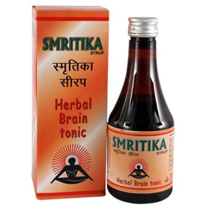 United Smritika Syrup contains Brahmi (Bacopa monnieri), Sankhpushpi (Convolvulus macrophyllus), Ashwagandha (Withania somnifera), Jatamansi (Nardostachys jatamansi), Shatavari (Asparagus racemosus) other herbs as a combination of ingredients. Key benefits/uses of United Smritika Syrup: - Herbal brain Tonic - Brain energy restorative - Recommended as the daily health supplement for students & working people with associated mental fatigue Direction for use/Dosage: - Children: One teaspoonful of United Smritika Syrup twice a day with water - Adults: One tablespoonful of United Smritika Syrup twice or thrice a day with water - Or as directed by the physician Indications: - Mental fatigue, lack of concentration, anxiety, stress & strain, insomnia Storage instructions: - Store the formulation in cool and dry place Safety information: - Read the label carefully before use - Do not exceed the recommended dose - Keep out of the reach and sight of children