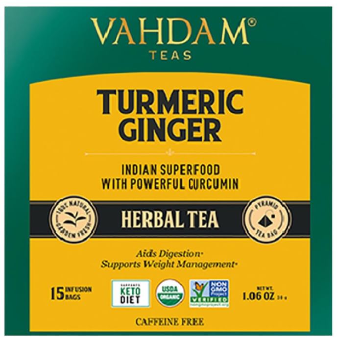 Vahdam Teas Herbal Tea Tisane (2gm Each) Turmeric Ginger Vahdam Teas Herbal Tea Tisane (2gm Each) is designed to build a strong immune system. It encompasses anti-inflammatory properties and may help to reduce the risk of heart diseases. In addition to this, it comes in four different variants namely, Turmeric Spiced, Turmeric Ginger, Turmeric Moringa, and Turmeric Ashwagandha.