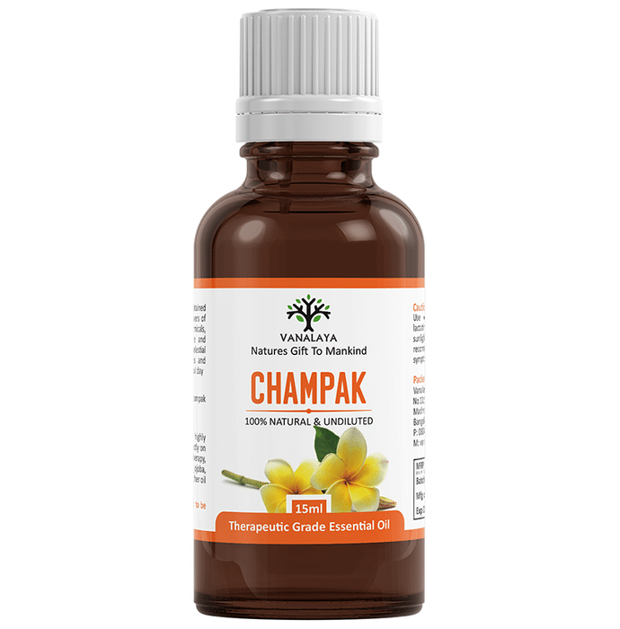 Vanalaya 100% Natural & Undiluted Oil provides the goodness of Champak, powerful fragrant blossoms of the Magnolia family, native to Southeast Asia. This tree shrub produces a complex citrus aroma, and owing to its delicate and seductive fragrance, it is widely used in aromatherapy to soothe, calm and relax the mind and body. | Key Ingredients: Champak Essential oil | Key Benefits: Known to be a great source of antioxidants, which can help fight against the signs of ageing Great for hair loss worries Its seductive and beautiful fragrance produces a celestial atmosphere that soothes, relaxes and strengthens the mind after a stressful day Champaka is often infused with nourishing oils to further enhance its antioxidant properties which deeply moisturise and rejuvenate the skin cells, to restore youthful and glowing skin The calming floral notes help relax the mind and uplift the mood Champaka is used as a stress-relieving herb that slackens the visual signs of stress. With reduced stress, fewer fine lines and wrinkles appear on the skin | Directions For Use: Mix 5-7 drops in the carrier oil of your choice to make a soothing massage oil Sprinkle a few drops on a dry and clean cloth or tissue and inhale Use an aromatherapy diffuser to disperse the aroma in your room | Safety Information: Read the label carefully before use Store in a cool and dry place away from direct sunlight Keep out of reach of the children