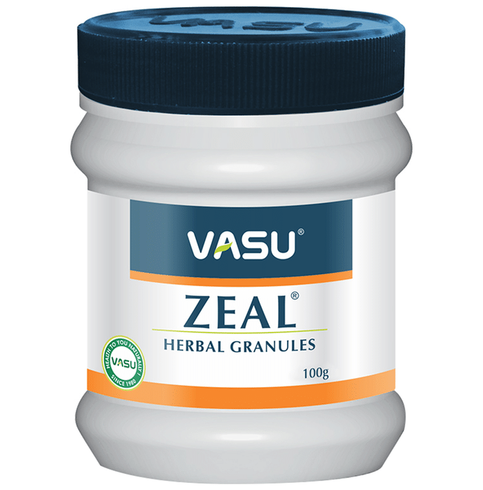 Vasu Zeal Herbal Granules Zeal Herbal Granules is a combination of selected herbs known for its beneficiary properties as an anti-viral, anti-bacterial and also as an immunomodulator. Zeal herbal granules can be taken by all age groups as a prophylactic, to prevent any viral infection. Zeal Herbal Granules is indicated in management and treatment of sinusitis, tonsillitis, nasal congestion, throat congestion, bronchospasm, bronchitis, dyspnoea, breathlessness, mild state of bronchial asthma and other upper and lower respiratory congestion conditions. Benefits of Zeal Herbal Granules: For treatment:- Relieves cough, cold and sore throat associated with swine flu infection. Clears infections of respiratory tract because of swine flu. For prevention:- Controls associated cough and cold and keeps the respiratory passage clear so as to prevent the infection. Strengthens lungs function thereby helps prevent LRTI. Strengthens immune system. Dosage: Adults- 1 teaspoon (5 gm), 2-3 times a day. Children- ? teaspoon (2.5 gm), 2-3 times a day. Zeal Herbal granules is safe, tasty and ensures refreshing sensation to nasal passage, clears nose and chest congestion with its warm soothing effect and delightful aroma. Directions for use: Dissolve in hot water and sip for faster relief. It gives appearance and feeling of hot herbal tea. Patient suffering from sore throat and dry cough can take with hot or lukewarm milk. Use under medical supervision