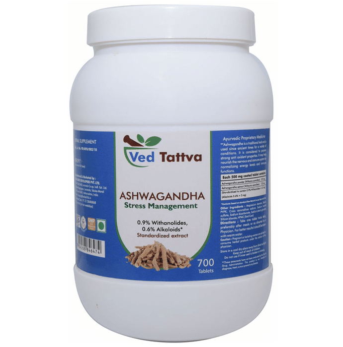 Ved Tattva Ashwagandha Stress Management Tablet Ashwagandha also called Withania somnifera is a herb that may reduce anxiety and stress levels. It increases vitality and vigour and controls fatigue. They are considered stress control management tablets. It has been used for years to boost immunity, relieve stress, increase energy levels and improve concentration. | Key Ingredients: Ashwagandha | Key Benefits: Relieves stress by reducing the level of stress hormones called cortisol It helps with stress and improves the metabolic activities of the body Its anti-oxidant property improves energy and increases stamina and endurance It is effective in relieving stress and helps enhance vigour and vitality | Directions For Use: Use as directed on the label or as advised by your healthcare provider | Safety Information: Read the label carefully before use Store in a cool and dry place away from direct sunlight Keep out of reach of children