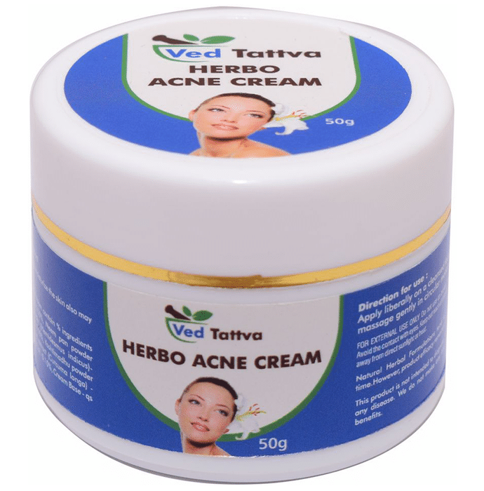 Ved Tattva Herbo Acne Cream This cream helps to make skin elastic and plump. Herbal goodness moisturises the skin, reduces age spots, soothes the skin and protects it from the sun's harmful effects. It strengthens the cells' ability to resist free radicals that injure your skin. It also aids in the production of collagen, which protects your skin from sunburns. | Key Ingredients: Shalmali powder Neem pan powder Sariva powder Kumari powder Yashtimadhu powder Turmeric liquid extract Wheatgerm oil Kumkumadi tail | Key Benefits: It helps reduce acne by exfoliating the skin and keeping pores clear Makes skin clear, even-toned and reduces dark marks post-breakout Helps to rejuvenate the skin and is effective in improving skin complexion and tone It penetrates the skin and works to dissolve the dead skin cells clogging your pores | Directions For Use: Use as directed on the label or as advised by your healthcare provider | Safety Information: Read the label carefully before use Store in a cool and dry place away from direct sunlight Keep out of reach of children