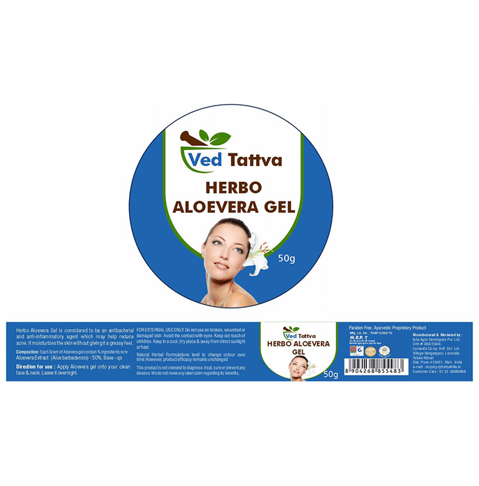 Ved Tattva Herbo Aloevera Gel Ved Tattva Herbo Aloevera Gel Aloe vera gel is considered to be an antibacterial and anti-inflammatory agent, which may help reduce acne. It moisturises the skin without giving it a greasy feel. It helps to keep the skin hydrated while soothing the irritation. Fighting acne and other skin blemishes may reduce various signs of ageing. It is also known to be beneficial for sunburn as it offers a calming and soothing effect.