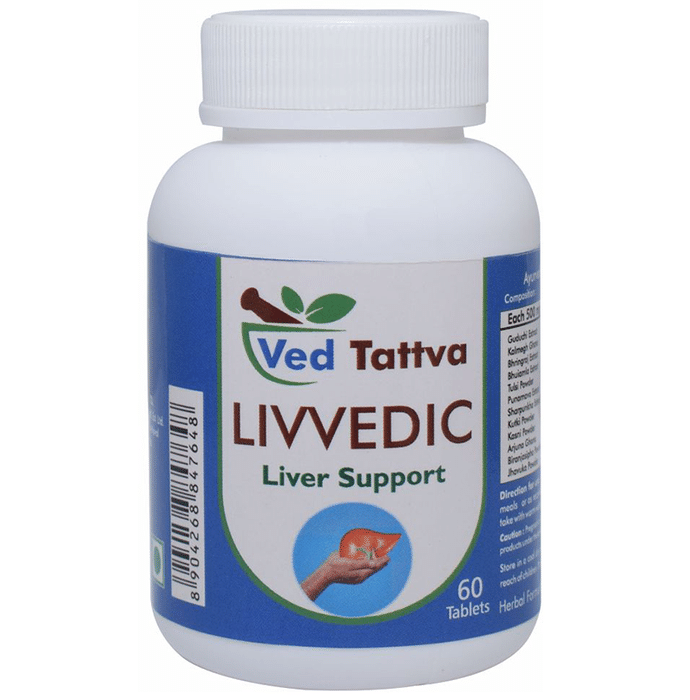 Ved Tattva Livvedic Liver Support Tablet LivVedic is an ideal hepatoprotective supplement which provides support for hepatic detoxification, maintains the integrity of liver cells and helps rejuvenate the liver. It is specially formulated to support liver health, using herbal extracts. | Key Ingredients: Guduchi extract Kalmegh ghana Bhringraj extract Bhuiamla extract Tulsi powder Punarnava extract Sharpunkha extract Kutki powder Kasni powder | Key Benefits: It helps curb all toxins by detoxifying the body and prevent from the damage caused by them It helps in improving liver function and also helps with its associated problems It ensures smooth functioning of all organs of the body It helps boosts the metabolism of the body | Directions For Use: Use as directed on the label or as advised by your healthcare provider. | Safety Information: Read the label carefully before use Store in a cool and dry place away from direct sunlight Keep out of reach of children