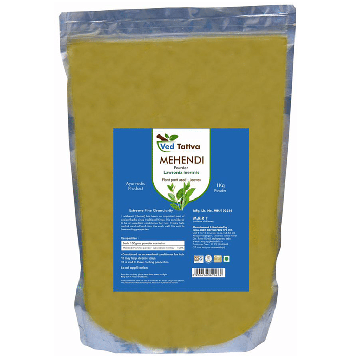 Ved Tattva Mehendi Lawsonia Inermis Powder Mehndi or henna powder is also known as Lawsonia inermis which is synergistically processed with highly advanced technology. The mehndi powder can be used for local application as natural hair colour and conditioner. | Key Ingredients: Henna powder | Key Benefits: It makes the hair stronger, thicker, and lustrous ensuring minimum damage It helps to balance the pH value of the scalp to its natural acid-alkaline level It acts as a natural hair dye and has cooling properties It helps to repair the unwanted split ends and gives deep nourishing to dry hair problems | Directions For Use: Use as directed on the label or as advised by your healthcare provider. | Safety Information: Read the label carefully before use Store in a cool and dry place away from direct sunlight Keep out of reach of children