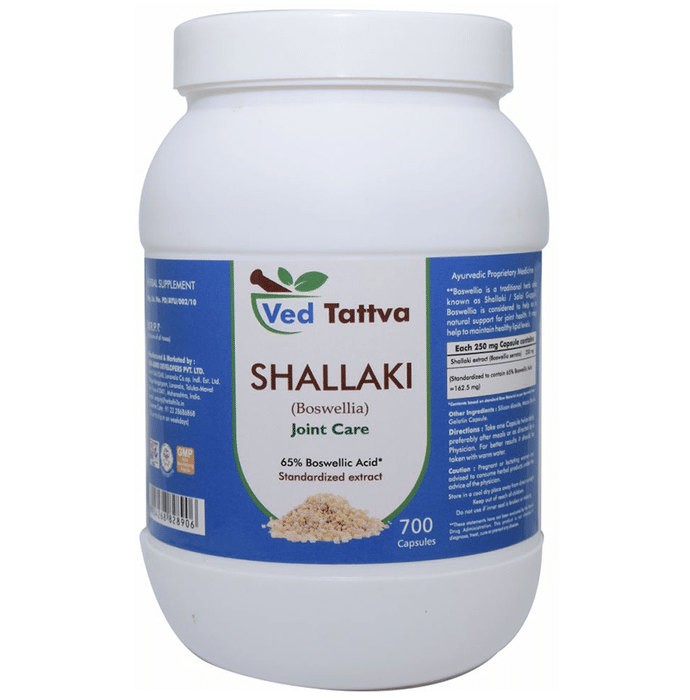 Ved Tattva Shallaki Boswellia Join Care Capsule It is an ayurvedic remedy specially formulated to prevent joint pain and is well known for its anti-inflammatory properties. It helps to rejuvenate the muscles and has diuretic properties. | Key Ingredients: Shallaki extract | Key Benefits: Helps to rejuvenate the muscles by treating swollen parts It strengthens the bone and cartilage system Useful in osteoarthritis, rheumatoid arthritis and joint pain It could help with osteoarthritis, fibrositis, rheumatism and lower back pain | Directions For Use: Use as directed on the label or as advised by your healthcare provider. | Safety Information: Read the label carefully before use Store in a cool and dry place away from direct sunlight Keep out of reach of children