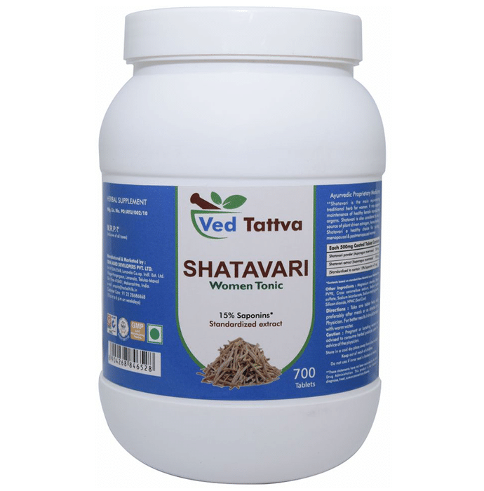 Ved Tattva Shatavari Women Tonic Tablet Shatavari Tablet nourishes the female reproductive hormones and organs. It is the ideal tonic for lactating and postmenopausal women. These tablets help boost immunity as they possess antioxidant and anti-inflammatory properties. | Key Ingredients: Shatavari | Key Benefits: Shatavari helps to manage menopausal symptoms like hot flashes, lack of sleep, depression, irritability, and vaginal dryness Balances hormones and helps in the management of premenstrual symptoms It helps improve breast milk production in lactating mothers Acts as a uterine tonic and helps to regulate the menstrual cycle | Directions For Use: Use as directed on the label or as advised by your healthcare provider. | Safety Information: Read the label carefully before use Store in a cool and dry place away from direct sunlight Keep out of reach of children