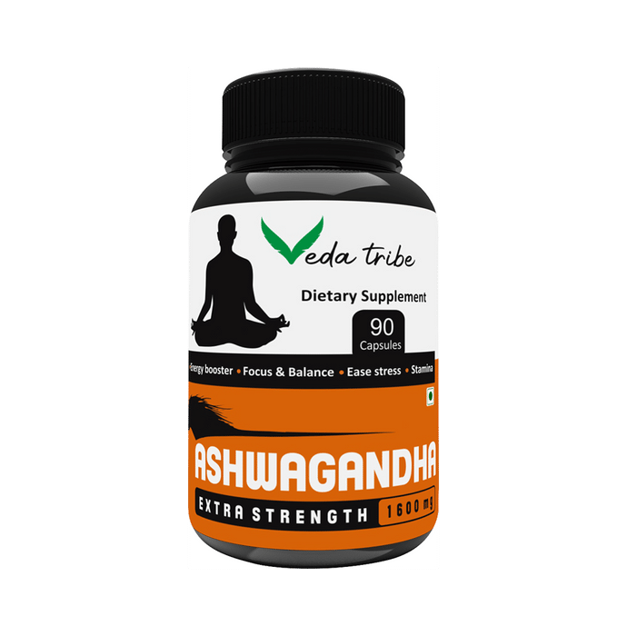 Veda Tribe Ashwagandha 1600 mg Capsule Ashwagandha plant is a little bush with yellow blossoms local to India and North Africa. Concentrates or powder from the plant's root or leaves are utilised to treat various conditions. It is one of the most significant spices in Ayurveda, a type of elective medication dependent on Indian standards of characteristic mending. Practitioners use this herb as a general tonic to boost energy, restore your body’s natural ability to cope with stressors, renew balance to your body’s endocrine, immune, cardiovascular, reproductive, and nervous systems. | Key Ingredient: Ashwagandha extract | Key Benefits: Ashwagandha may help brain function, lower blood sugar and cortisol levels, and help fight symptoms of anxiety and depression It may help reduce stress and anxiety It may improve muscle mass and strength | Directions For Use: Take one capsule a day before or after a meal or as directed by your healthcare professional. | Safety Measures: Read the label carefully before use Do not exceed the recommended dosage Keep it away from the reach of children