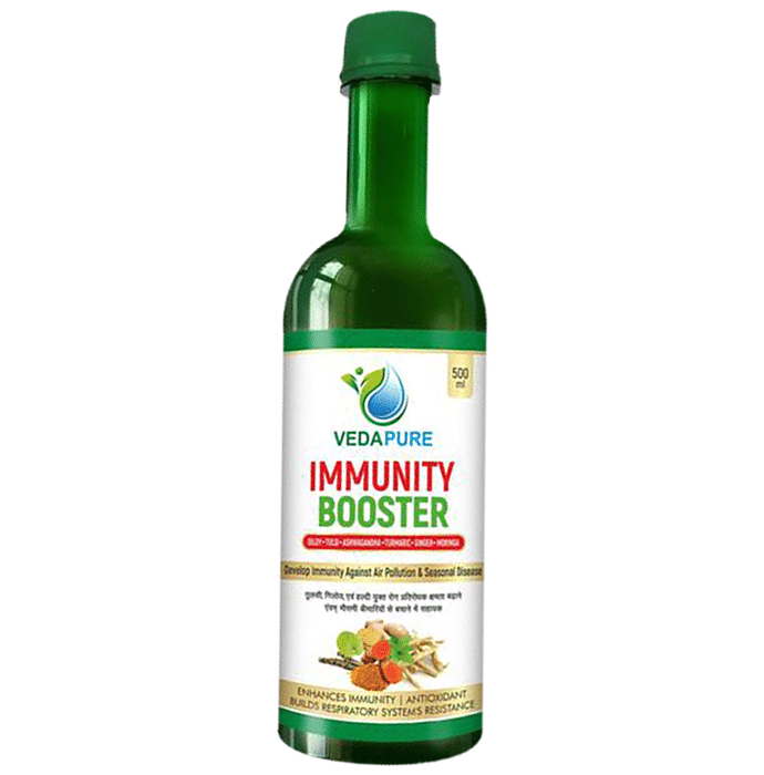 Vedapure Immunity Booster Liquid Vedapure Immunity Booster Liquid is made from organically sourced giloy that grows on neem trees and freshly-cut, nutrient-rich wild tulsi leaves which are free of urban pollutants. We use hard, mature giloy stems because they have maximum nutrition. The juice is extracted from the combo of tulsi leaves and giloy stems, mixed in a ratio to ensure maximum health benefits.
