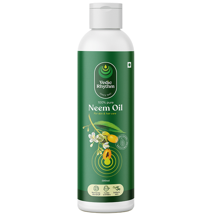 Vedic Rhythm Hair and Skin Care Neem Oil Vedic Rhythm Hair and Skin Care Neem Oil is pure neem oil that is power-packed with the goodness of real neem seeds. Our pure neem oil is authentic, pure, natural, and hexane-free. This essential oil is a perfect natural anti-ageing moisturiser, antiseptic, insecticide and fungicide. Neem Oil is quite effective in healing acne scars, itching, infections, irritation, dandruff, lice, etc. It is also a hydrating oil that moisturises the skin and hair and makes them soft.