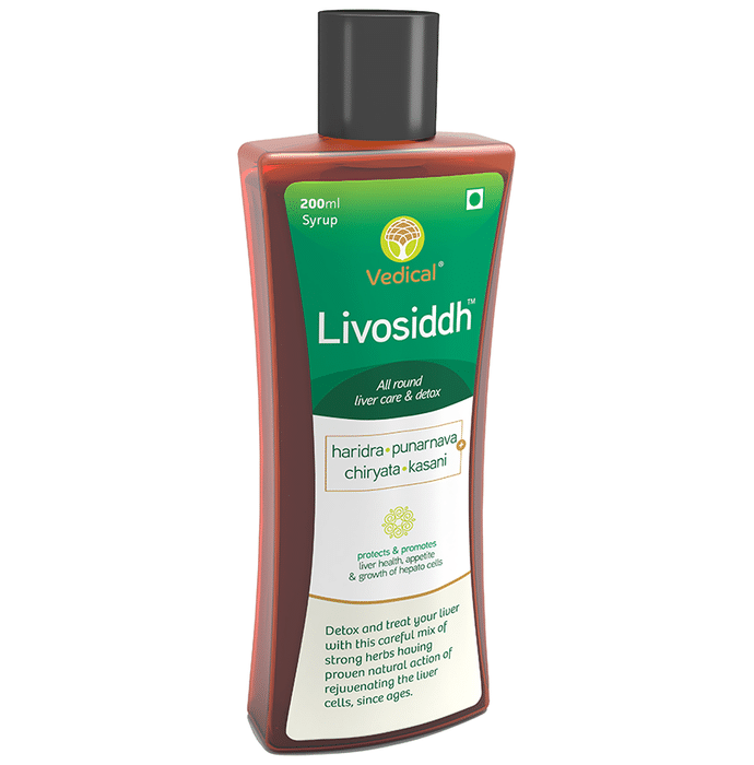 Vedical Livosiddh Syrup is an ayurvedic remedy which has a rejuvenating effect on liver .It not only helps in rejuvenating liver cells but also protects liver from various hepatic-toxins. It is also useful in increasing the appetite and growth of hepatic cells. | Key Ingredients: Chirayta Punarnava Kasani Haridra | Key Benefits: Promotes liver health Aids in preventing loss of appetite Useful in correcting liver dysfunction & damage Protects liver from hepatic-toxins | Directions For Use: Take 1-2 Teaspoons per day or as directed by the doctor. | Safety Information: Read the label carefully before use Keep away from children Do not exceed the recommended dosage Store in a cool and dry place