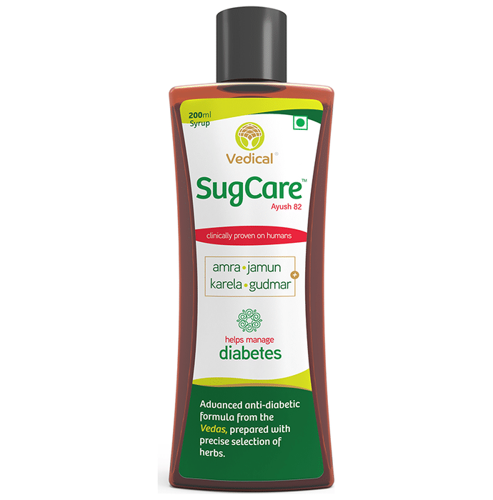 Vedical SugCare Syrup is an ayurvedic remedy which is helpful in managing mild to moderate diabetes. It is based on formulation of herbs such as Amra, Jamun, Karela and is effective in relieving complications of Diabetes. It is safe to use and is also beneficial for people with high sugar levels or advance-staged diabetes if taken in synergy for a few weeks. | Key Ingredients: Amra Jamun Gudmar Karela | Key Benefits: Helps in regulating diabetes and associated complications Useful in case of mild to moderate diabetes Formulated with herbs Clinically tested on humans | Directions For Use: Take 1-2 teaspoons twice a day 30 minutes before meal or as directed by the doctor. | Safety Information: Read the label carefully before use Keep away from children Do not exceed the recommended dosage Store in a cool and dry place