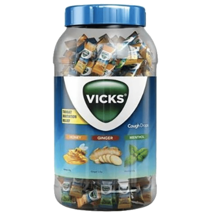 Vicks Cough Drops Vicks Cough Drops Lozenges Assorted work as a cough suppressant and an oral anaesthetic to stop dry cough. It may help in relieving minor throat irritations. It is an ayurvedic medicine and is available in 4 flavours- Tulsi, Menthol, Ginger, and Honey.