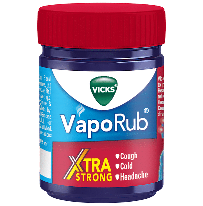 Vicks Vaporub Xtra Strong provides a life free from headaches and common cold irritation. It gives relief from cough and stuffy nose. | Key Ingredients: Camphor Menthol Eucalyptus | Key Benefits: Vicks Vaporub Xtra Strong provides a sense of comfort It fights against the irritating situation of cold and cough It combats headache It gives relief from congested nose It helps manage the condition of runny nose | Directions for Use: Read the label carefully | Safety Information: Not meant for oral consumption Do not exceed the recommended level Store in a cool, dry place Keep out of reach of children