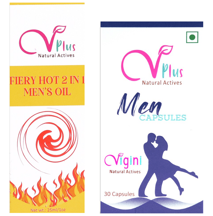 VPlus Natural Actives Fiery Hot 2 in 1 Men's Oil 25ml & Men 30 Capsule is specially formulated for men. The products are made with natural ingredients. While the oil provides easy lubrication, the capsules increase endurance and vitality. | Key Ingredients: | Natural Actives Fiery Hot 2 in 1 Men's Oil: Ylang Ylang Essential Oil Javadi Kasturi Nargis Oil Extract Tulsi Oil Javatri Oil Samunderfal Extract Akarkara Oil Jaiphal Oil Laung Oil Dalchini Hibiscus Extract Karpasa | V Plus Men's Capsule: Tribulus terrestris Jeevanti Ashwagandha Kapikacchu Bala Jaiphal Akarkara Safed Musli Salab Mishri | Key Benefits: | Natural Actives Fiery Hot 2 in 1 Men's Oil: Made with natural ingredients Provides easy lubrication | V Plus Men's Capsule: Ashwagandha reduces stress and anxiety Ashwagandha boosts fertility in men Safed musli is helpful for physical weakness It increases endurance and vitality in men | Directions For Use: | Natural Actives Fiery Hot 2 in 1 Men's Oil: Take 8 to 10 drops of oil on the palm and softly massage till completely absorbed. | V Plus Men's Capsule: Take one capsule twice daily or as directed by a health professional. | Safety Information: Read the label carefully before use Store in a cool and dry place away from direct sunlight Keep out of reach of the children