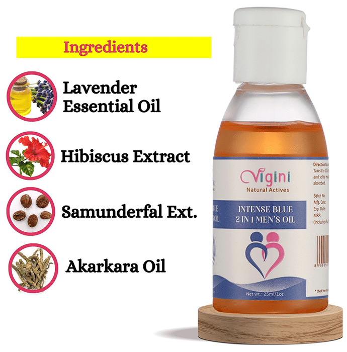 Vigini VPlus Natural Actives Intense Blue 2 in 1 Men's Oil Vigini Intense Blue 2 in 1 Men's Oil restores blood flow and stimulates the production of testosterone which increase libido. This nourishes and increases levels of nitric oxide from the nerve endings of muscles increasing stamina and libido. So, not only does the oil improve sexual health and strength, but also increase the blood flow into the organ. It helps in enhancement and increases energy and stamina and improves overall satisfaction.