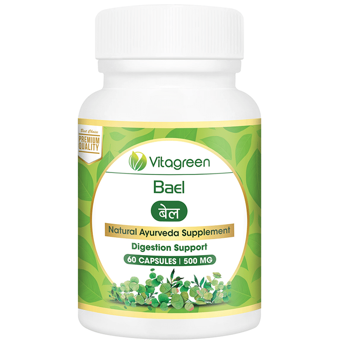 Vitagreen Bael 500mg Capsule Vitagreen Bael 500mg Capsule has antibacterial properties and benefits digestion and inflammation. It can keep your skin healthy and may help lower cholesterol levels in the blood. It is also helpful in relieving acidity or constipation.