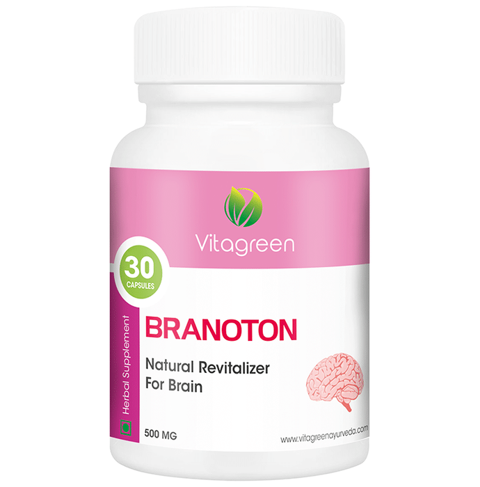Vitagreen Branoton 500mg Capsule Vitagreen Branoton 500mg Capsule is a herbal product beneficial for brain function. It may help to improve memory, concentration and focus. It may also be helpful for stress, anxiety and irritation. It can maintain the oxygen and glucose metabolism in the brain.