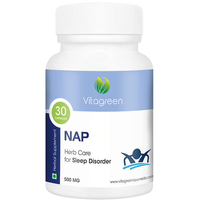 Vitagreen Nap 500mg Capsule NAP is an excellent herbal sleeping pill that is non-addictive and has a strong sedative effect. It relaxes your mind from stress and tension and provides sound sleep. Proper sleep can keep your mind fresh and boost the energy levels in the body. | Key Ingredients Valeriana wallichi Papaver somniferum Centella asiatica | Key Benefits: It is a herbal formulation for sleep disorder It is an ayurvedic product that has no artificial colours, flavours, wheat, corn, yeast, soy and dairy products It relaxes your mind from stress and tension and provides sound sleep It can keep your mind fresh and boost the energy level in the body It helps with insomnia and other sleeping problems It is beneficial for stress relief and anxiety | Directions For Use: Take one capsule daily with a glass of water | Safety Information: Store in a cool and dry place away from direct sunlight Read the label carefully Keep out of reach of children Use under medical supervision Don’t exceed the recommended dosage