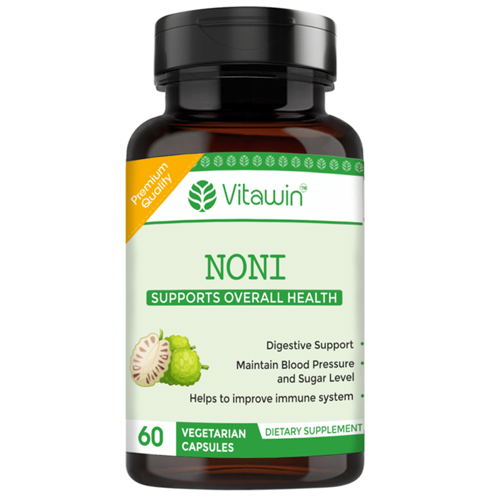 Vitawin Noni Vegetarian Capsule is a herbal formulation made with noni that can improve immunity and digestion. It can boost the overall energy level. It can help maintain healthy blood sugar levels and helps reduce carbohydrate and sugar absorption. It may promote heart health. It is rich in antioxidants and helps to improve skin health. | Key Ingredients: Noni extract Excipients | Key Benefits: This capsule can boost immunity and energy level in the body It can provide relief from arthritis This capsule can promote heart and skin health It can help to regulate the blood sugar level This can improve digestion and promote general health and well being | Directions For Use: Use as directed on the label or as advised by your healthcare provider. | Safety Information: Read the label carefully before use Do not exceed the recommended dosage Store in a cool and dry place away from direct sunlight Keep out of reach of children