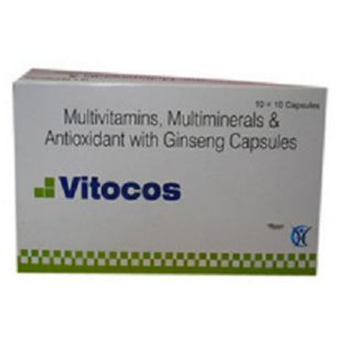 Vitocos capsule is an advanced formula of high concentration of Vitamins, Essential minerals, Antioxidant and Ginseng. Ginseng is widely used for antistress, anticancer, immune system modulation, cardiovascular, CNS, and hormonal effects. Antioxidants benefit the body by neutralizing and removing the free radicals from the bloodstream. Vitocos capsule can be used a nutritional supplement and aids in the absorption of calcium by the body as well. Vitocos can be used in treating all immune deficiency disorders . Vitocos is the best nutritional support in cardiac, diabetic, tubercular and rheumatic patients as well as those suffering from acute and chronic diseases. Vitocos Tablets recommended as a dietary supplement beneficial in the following conditions: Loss of appetite Convalescence Fatigue or general debility During growth, Pregnancy & Surgery Vitamin & Minerals deficiency Use under medical supervision